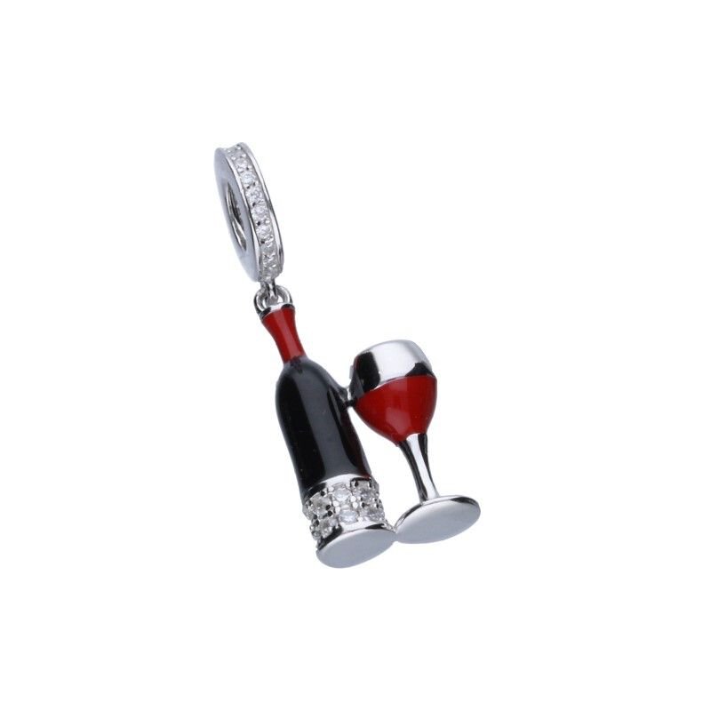 ZAWIESZKA WISZĄCA TYPU BEAD PASUJĄCA DO BRANSOLET MODUŁOWYCH O ŚREDNICY MAX 3mm, SREBRO PRÓBY 925 RODOWANE, CZERWONA I CZARNA EMALIA, BIAŁE CYRKONIE, KIELISZEK, WINO, WYMIARY ZAWIESZKI 11mm X 19mm.