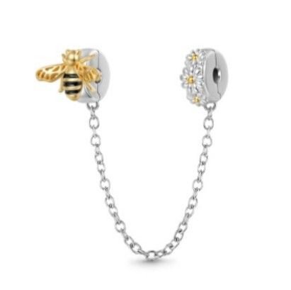 ZAWIESZKA ZABEZPIECZAJĄCA NA ŁAŃCUSZKU TYPU BEAD PASUJĄCA NA BRANSOLETY MODUŁOWE O ŚREDNICY MAX 3mm, SREBRO PRÓBY 925 RODOWANE I POZŁACANE 24 KARATOWYM ZŁOTEM, CZARNA EMALIA, KWIATUSZKI, PSZCZÓŁKA O WYMIARACH 9mm X 13mm.
