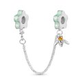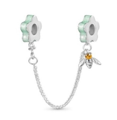 ZAWIESZKA ZABEZPIECZAJĄCA NA ŁAŃCUSZKU TYPU BEAD PASUJĄCA NA BRANSOLETY MODUŁOWE O ŚREDNICY MAX 3mm, SREBRO PRÓBY 925 RODOWANE, EMALIA W KOLORZE MIĘTOWYM, CYRKONIA W KOLORZE SZAMPANA, KWIATUSZKI, PSZCZÓŁKA O WYMIARACH 8mm X 11mm.