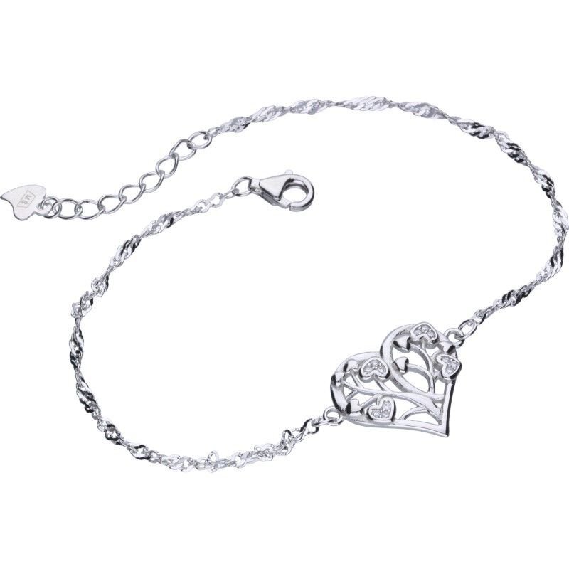 BRANSOLETKA NA ŁAŃCUSZKU O SPLOCIE TYPU SINGAPUR, SREBRO PRÓBY 925 RODOWANE, DŁUGOŚĆ 18cm+2cm PRZEDŁUŻKA, BIAŁE CYRKONIE, DRZEWKO ŻYCIA, AŻUROWE SERCE O WYMIARACH 15mm X 16mm.