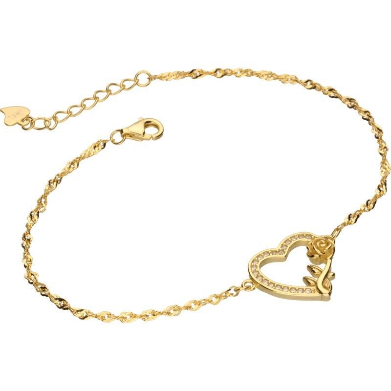 BRANSOLETKA NA ŁAŃCUSZKU O SPLOCIE TYPU SINGAPUR, SREBRO PRÓBY 925 POZŁACANE 24 KARATOWYM ZŁOTEM, DŁUGOŚĆ 18cm+2cm PRZEDŁUŻKA, BIAŁE CYRKONIE, KWIAT, RÓŻA, SERCE O WYMIARACH 15mm X 15mm.