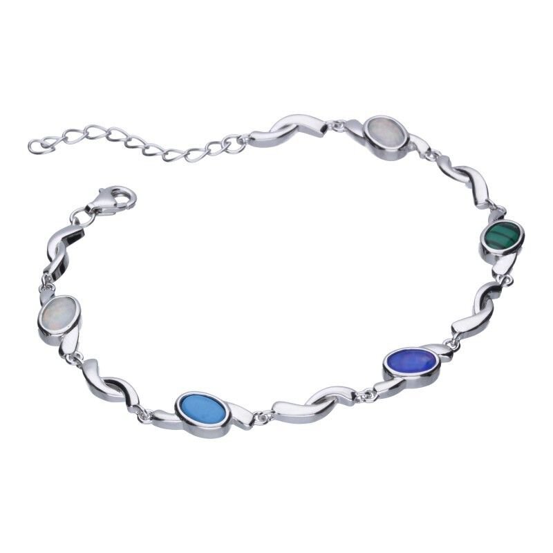 BRANSOLETKA Z KAMIENIAMI OPRAWIONYMI W OWALNĄ RAMKĘ, SREBRO PRÓBY 925 RODOWANE, BIAŁY I NIEBIESKI OPAL, MALACHIT I TURKUS, DŁUGOŚĆ 17cm +3cm PRZEDŁUŻKA. \r\n\r\n\r\n\r\n