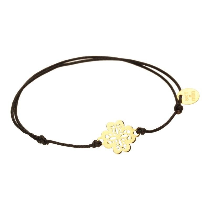 BRANSOLETKA NA SZNURKU JUBILERSKIM W KOLORZE CZARNYM, ELEMENTY ZŁOTO PRÓBY 585, DŁUGOŚĆ REGULOWANA, OWALNA BLASZKA O WYMIARACH 5mm X 7mm PLUS AŻUROWA KONICZYNKA O WYMIARACH 10mm X 10mm, WAGA SAMEGO ZŁOTA BEZ SZNURKA 0,36g, 14K.