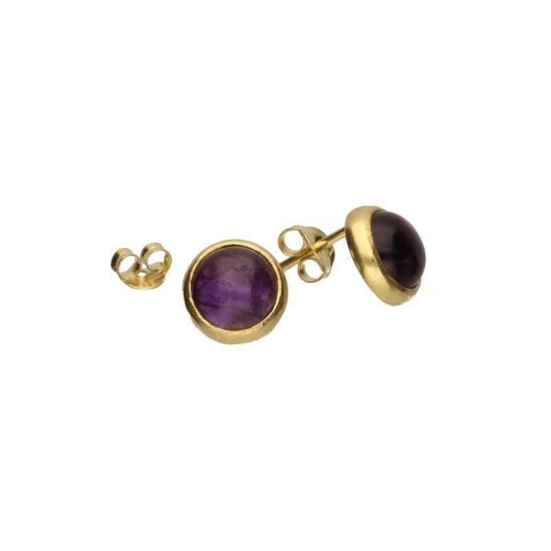KOLCZYKI NA SZTYFCIE Z KAMIENIAMI NATURALNYMI, SREBRO PRÓBY 925 POZŁACANE 24 KARATOWYM ZŁOTEM, AMETYST ZAKUWANY W OZDOBNĄ RAMKĘ, ŚREDNICA KOLCZYKÓW 10mm.