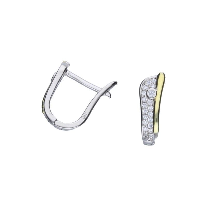 KOLCZYKI NA ANGIELSKIM ZAPIĘCIU, POŁĄCZENIE SREBRA PRÓBY 925 RODOWANEGO Z POZŁACANYM 24 KARATOWYM ZŁOTEM, BIAŁE CYRKONIE, WYMIARY KOLCZYKÓW 5mm X 14mm.