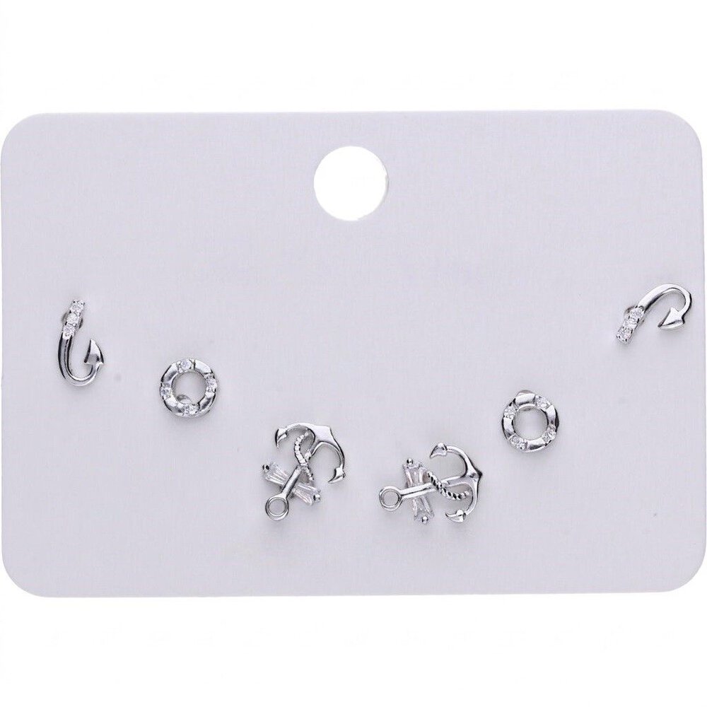 TRZY PARY RÓŻNYCH KOLCZYKÓW NA SZTYFCIE, SREBRO PRÓBY 925 RODOWANE, BIAŁE CYRKONIE, KOŁO RATUNKOWE O ŚREDNICY 5mm, HAK O WYMIARACH 4mm X 7mm, KOTWICA O WYMIARACH 7mm X 9mm.