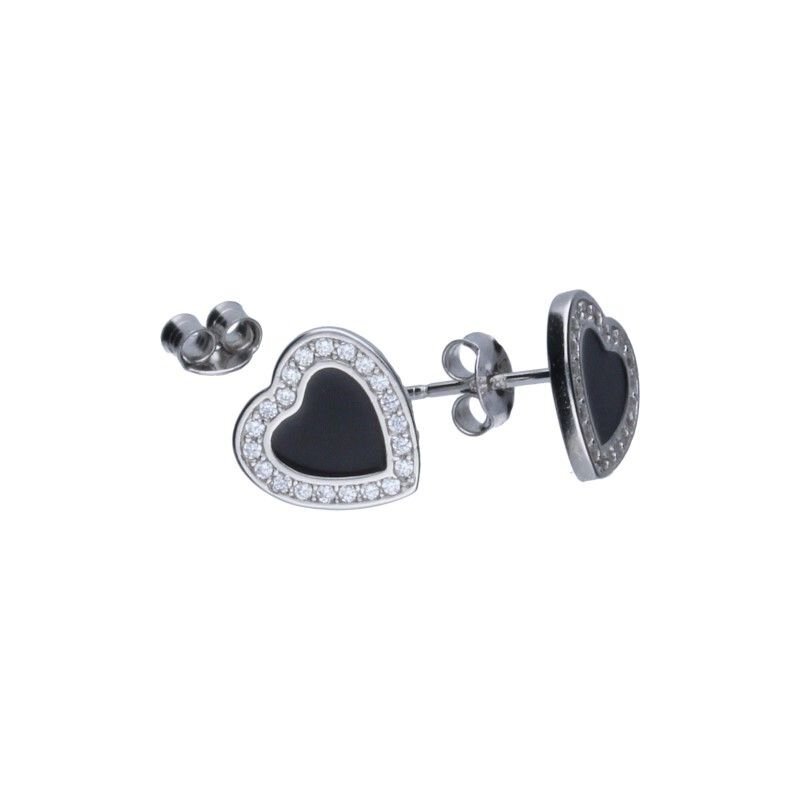 KOLCZYKI NA SZTYFCIE, SREBRO PRÓBY 925 RODOWANE, BIAŁE CYRKONIE, SERCA W KOLORZE CZARNYM, SERCE, WYMIARY KOLCZKÓW 10mm X 10mm.