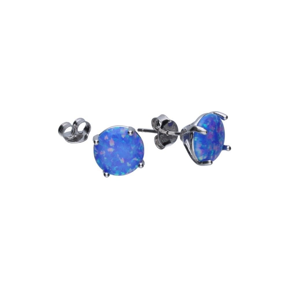 KOLCZYKI NA SZTYFCIE, SREBRO PRÓBY 925 RODOWANE, NIEBIESKI OPAL Z MIENIĄCYMI SIĘ DROBINKAMI W KOLORZE RÓŻOWYM, OKRĄGŁY ZŁAPANY W SREBRNE ŁAPKI, ŚREDNICA 9mm.