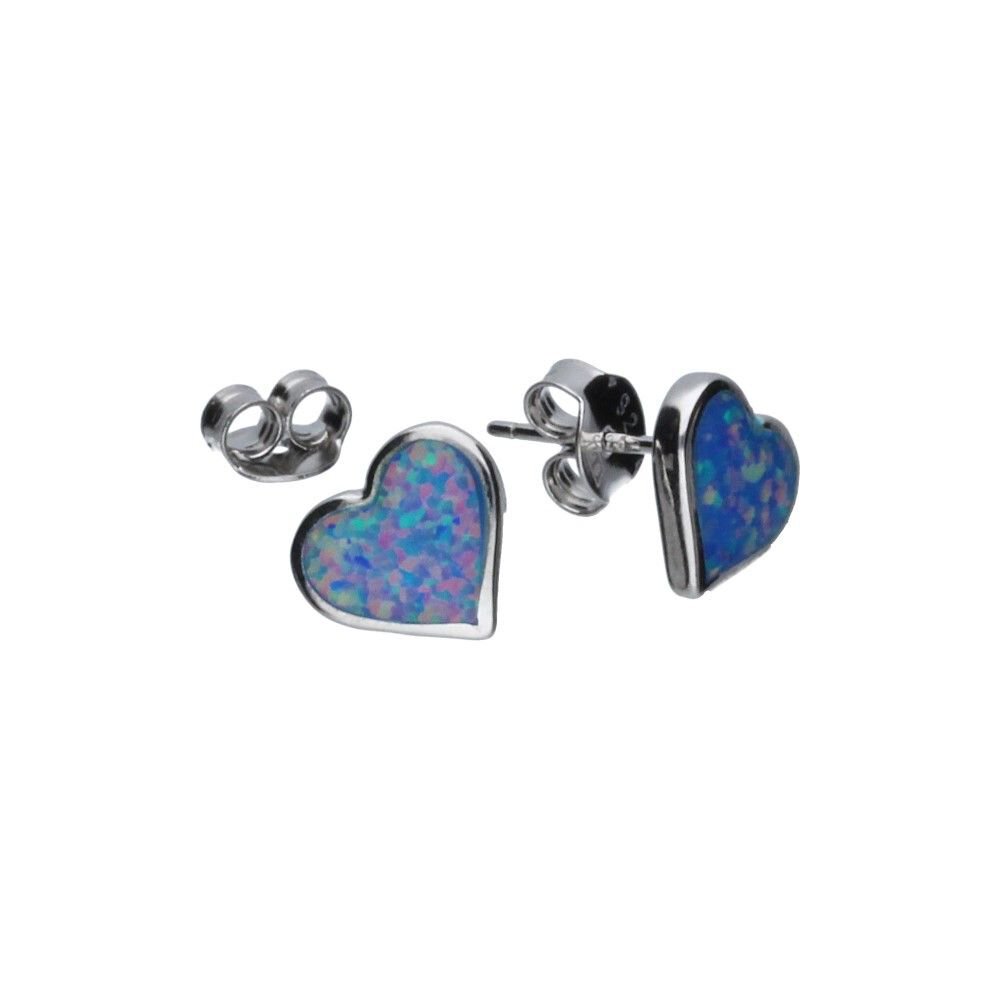 KOLCZYKI NA SZTYFCIE, SREBRO PRÓBY 925 RODOWANE, NIEBIESKI OPAL Z MIENIĄCYMI SIĘ DROBINKAMI W KOLORZE RÓŻOWYM, SERCE, SERCA, SERDUSZKA, WYMIARY KOLCZYKÓW 8mm X 9mm.