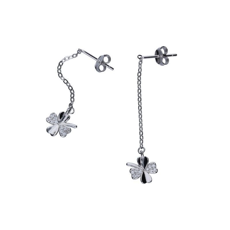 KOLCZYKI NA SZTYFCIE WISZĄCE, SREBRO PRÓBY 925 RODOWANE, BIAŁE CYRKONIE, DŁUGOŚĆ KOLCZYKÓW 40mm, BIAŁE CYRKONIE, CZTEROLISTNA KONICZYNKA O WYMIARACH 8mm X 8mm.