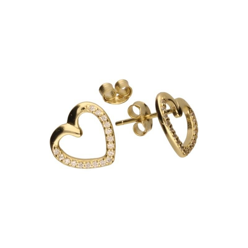 KOLCZYKI NA SZTYFCIE Z CYRKONIAMI, SREBRO PRÓBY 925 POZŁACANE 24 KARATOWYM ZŁOTEM, CYRKONIE W KOLORZE BIAŁYM, SERDUSZKO, SERCA, KOLCZYKI O WYMIARACH 10mm X 11mm.