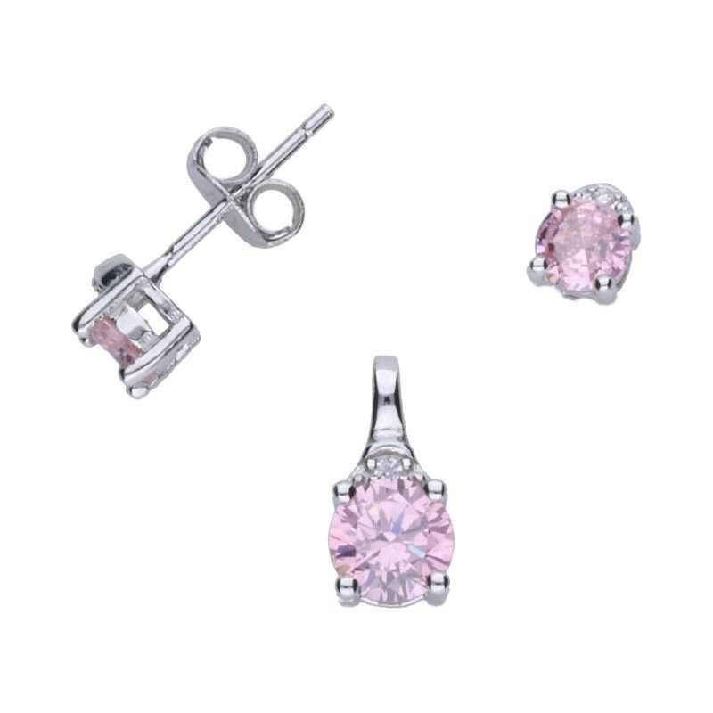 KOMPLET ZAWIESZKA PLUS KOLCZYKI NA SZTYFCIE, SREBRO PRÓBY 925 RODOWANE, ZAKUWANE CYRKONIE W KOLORZE BIAŁYM I RÓŻOWYM, WYMIARY ZAWIESZKI 5mm X 10mm.