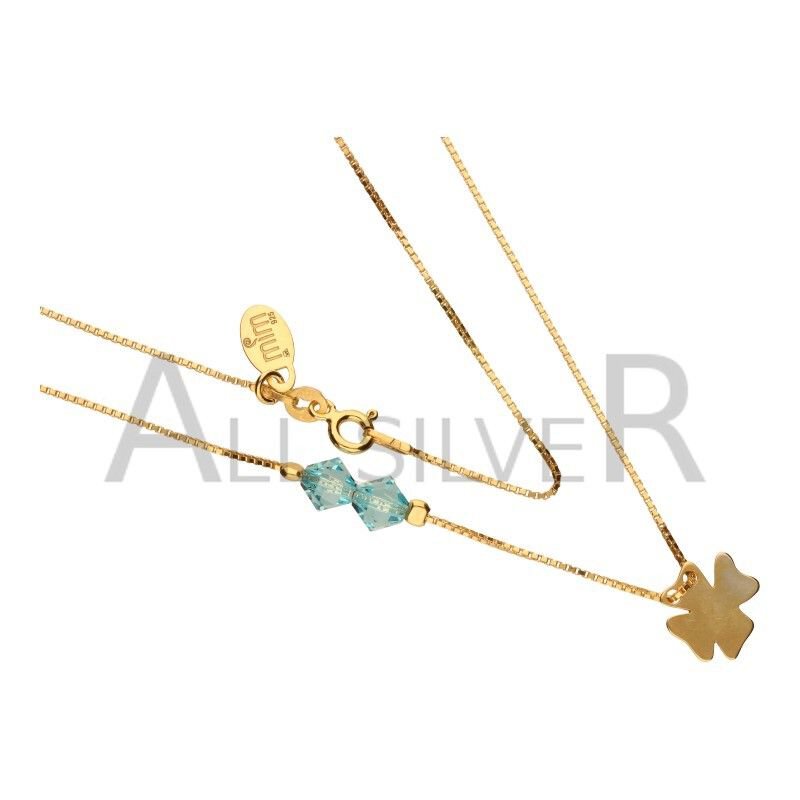 NASZYJNIK, SREBRO PRÓBY 925 POZŁACANE 24 KARATOWYM ZŁOTEM, SPLOT ŁAŃCUSZKA KOSTKA WENECJANA, DŁUGOŚĆ 41CM, DWA KRYSZTAŁKI SWAROVSKIEGO W KOLORZE AQUAMARINE, KONICZYNKA, MECHANICZNIE POLEROWANY.\r\n\r\n