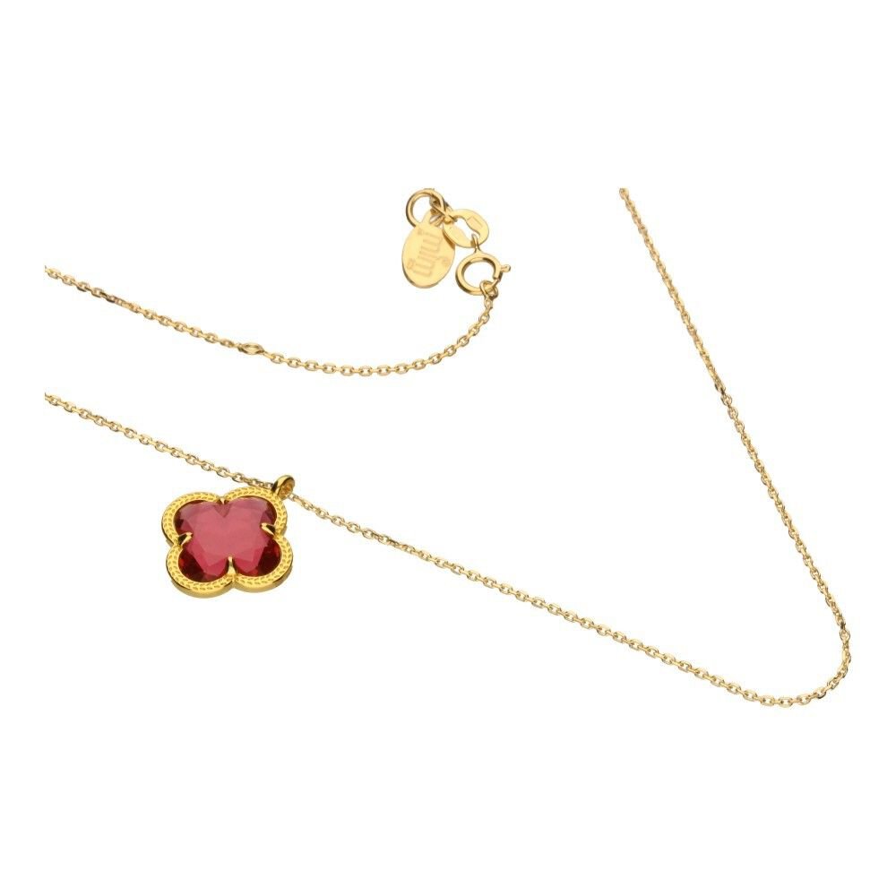 NASZYJNIK Z MOTYWEM KONICZYNY MAROKAŃSKIEJ, SREBRO PRÓBY 925 POZŁACANE 24 KARATOWYM ZŁOTEM, FASETOWANY KAMIEŃ W KOLORZE RUBINU, KONICZYNKA O WYMIARACH 14mm X 15mm, DŁUGOŚĆ NASZYJNIKA 42cm + 3cm PRZEDŁUŻKA.