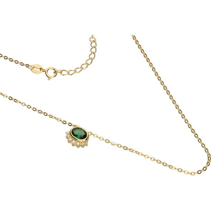 NASZYJNIK NA ŁAŃCUSZKU O SPLOCIE TYPU ANKIER, SREBRO PRÓBY 925 POZŁACANE 24 KARATOWYM ZŁOTEM, DŁUGOŚĆ 42cm+3cm PRZEDŁUŻKA, CYRKONIE W KOLORZE EMERALD I BIAŁYM, WYMIARY OZDOBNEGO MOTYWU 8mm X 10mm.