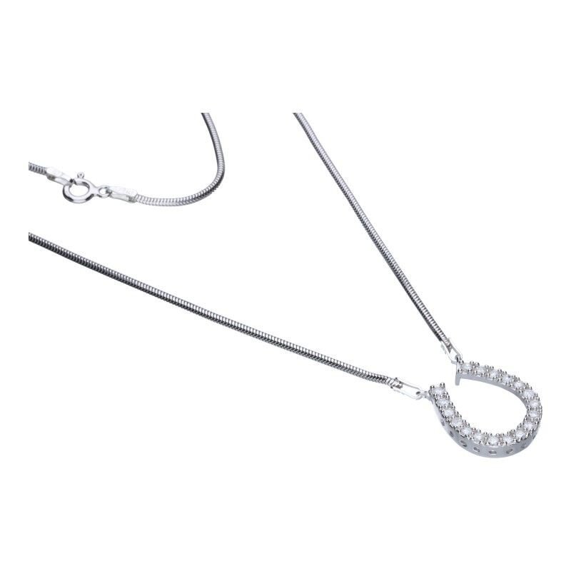 NASZYJNIK NA LINCE, SREBRO PRÓBY 925 RODOWANE, DŁUGOŚĆ 43cm, PODKOWA Z BIAŁYMI CYRKONIAMI O WYMIARACH 15mm X 18mm.