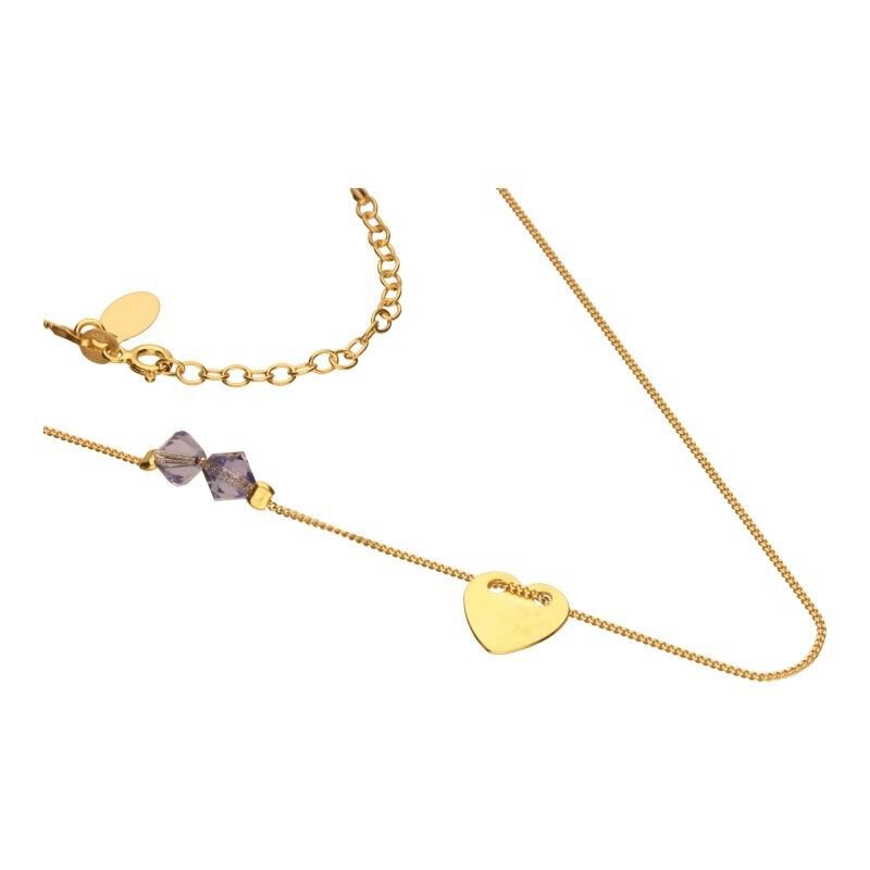 NASZYJNIK, SREBRO PRÓBY 925 POZŁACANE 24 KARATOWYM ZŁOTEM, SPLOT ŁAŃCUSZKA PANCERKA, DŁUGOŚĆ 37,5cm+ 5cm PRZEDŁUŻKA, DWA KRYSZTAŁKI SWAROVSKIEGO W KOLORZE AMETYSTU, GŁADKIE SERCE O WYMIARACH 11mm X 11mm, MECHANICZNIE POLEROWANY.