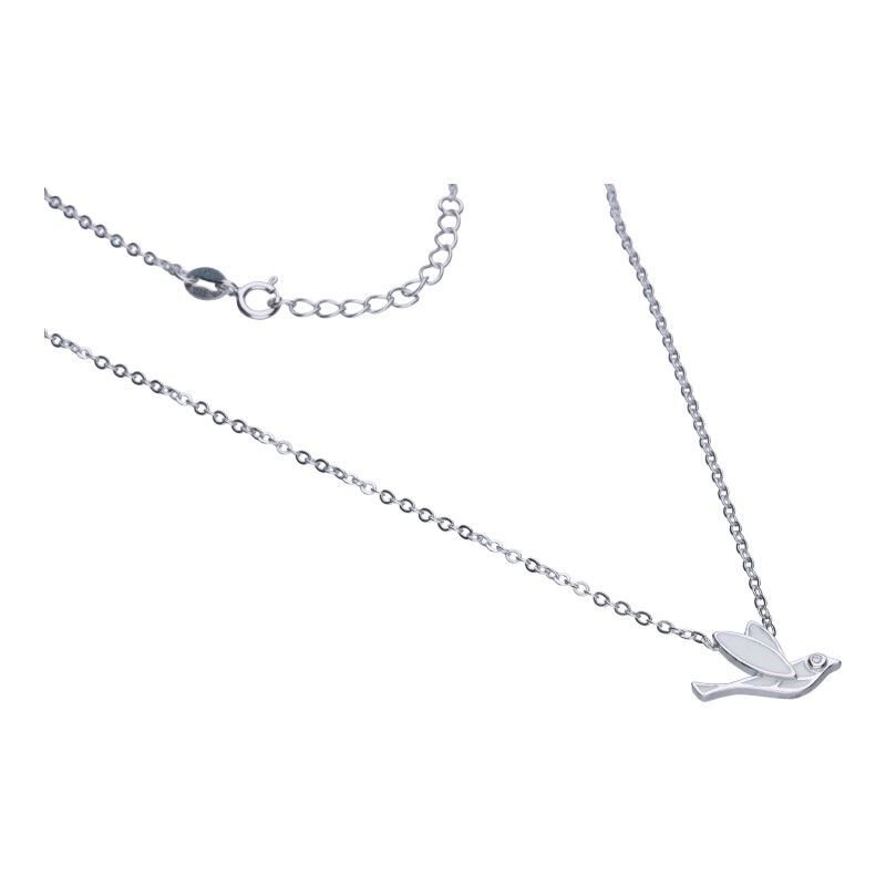 NASZYJNIK, SREBRO PRÓBY 925 RODOWANE, BIAŁE CYRKONIE, BIAŁA EMALIA, PTASZEK O WYMIARACH 10mm X 16mm.
