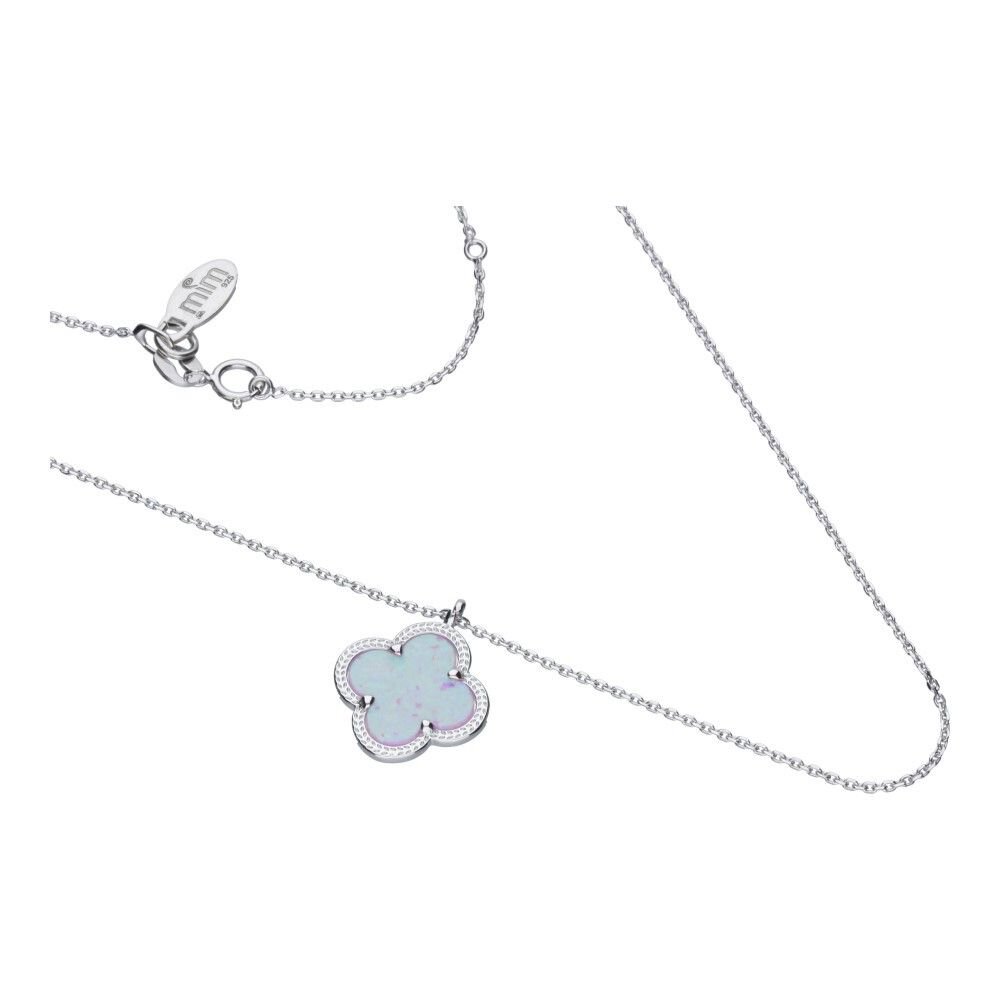 NASZYJNIK Z MOTYWEM KONICZYNY MAROKAŃSKIEJ, SREBRO PRÓBY 925 RODOWANE, OPAL W KOLORZE FIOLETOWYM I RÓŻOWYM, KONICZYNKA O WYMIARACH 14mm X 15mm, DŁUGOŚĆ NASZYJNIKA 42cm + 3cm PRZEDŁUŻKA.