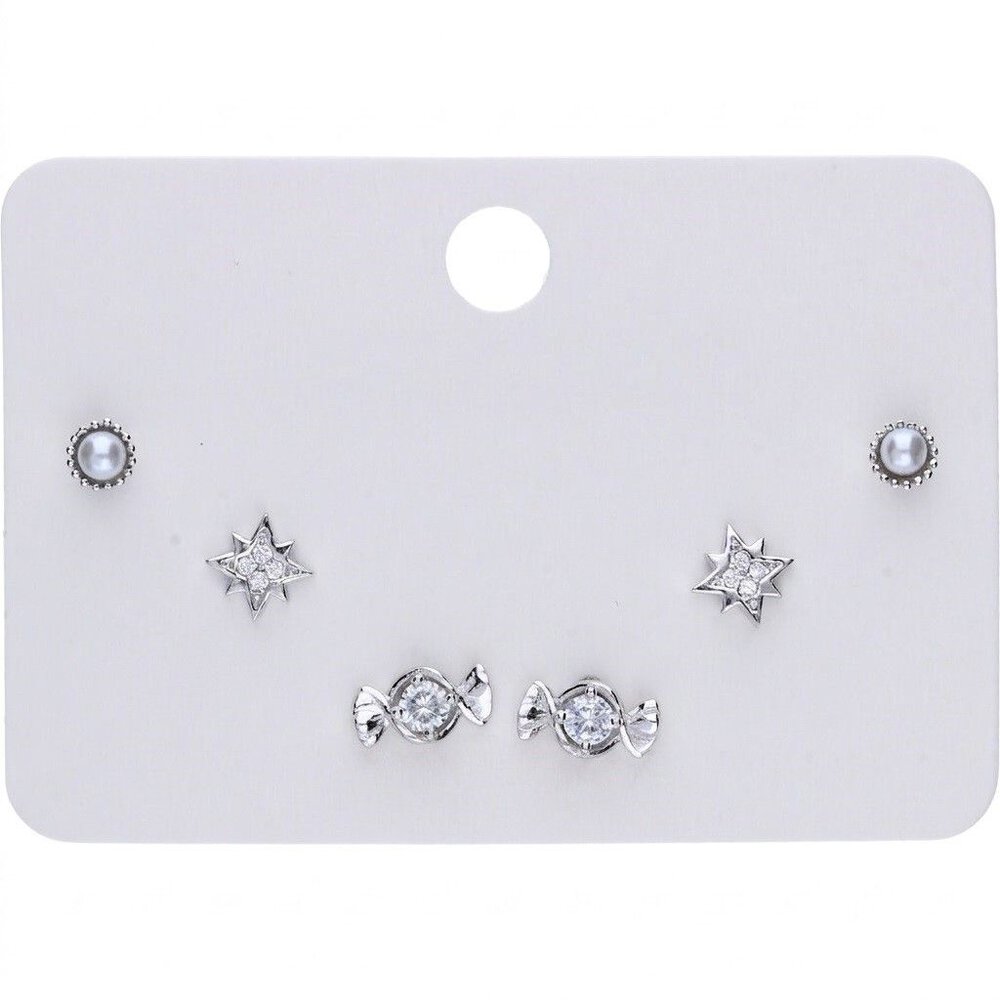 TRZY PARY RÓŻNYCH KOLCZYKÓW NA SZTYFCIE, SREBRO PRÓBY 925 RODOWANE, BIAŁE CYRKONIE, BIAŁE PEREŁKI, GWIAZDKI, CUKIERKI.