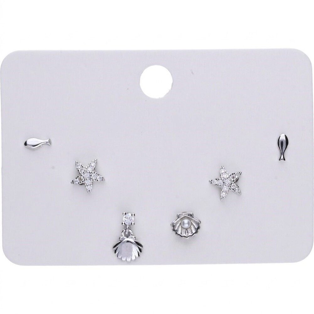 TRZY PARY RÓŻNYCH KOLCZYKÓW NA SZTYFCIE, SREBRO PRÓBY 925 RODOWANE, BIAŁE CYRKONIE, PEREŁKA, MUSZELKI, ROZGWIAZDA, RYBKI.