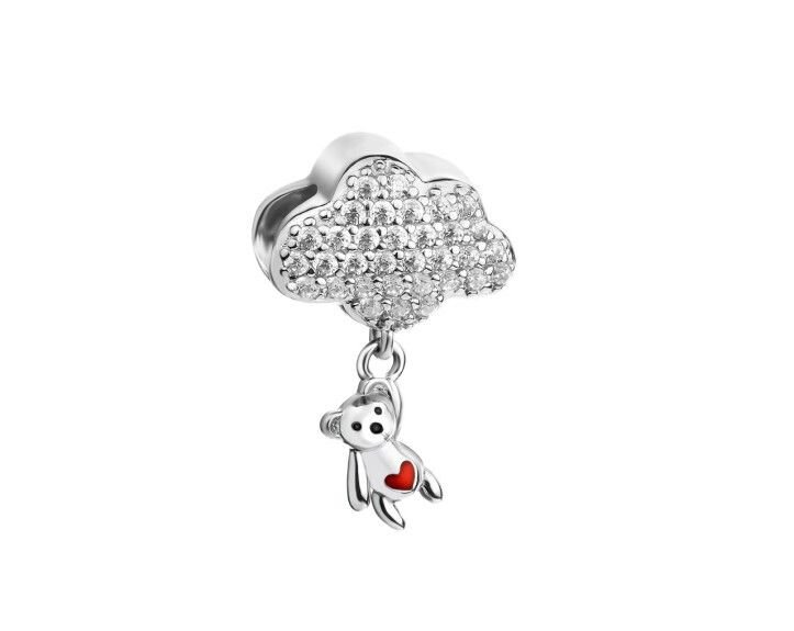 ZAWIESZKA TYPU BEAD PASUJĄCA NA BRANSOLETY MODUŁOWE O ŚREDNICY MAX 3mm, SREBRO PRÓBY 925 RODOWANE, BIAŁE CYRKONIE, CZERWONA EMALIA, SERDUSZKO, SERCE, MIŚ, CHMURKA O WYMIARACH 11mm X 14mm.