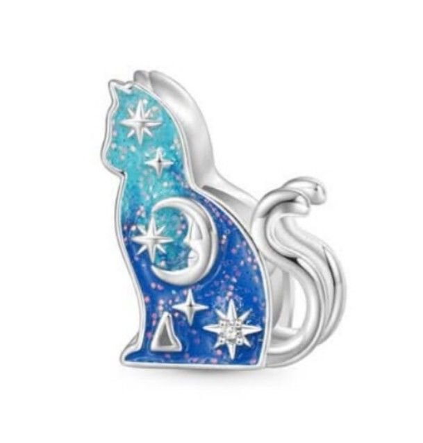 ZAWIESZKA TYPU BEAD PASUJĄCA NA BRANSOLETY MODUŁOWE O ŚREDNICY MAX 3mm, SREBRO PRÓBY 925 RODOWANE, KOLOROWA EMALIA, BIAŁE CYRKONIE, GWIAZDKI, KSIĘŻYC, KOTEK O WYMIARACH 10mm X 12mm.