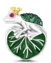ZAWIESZKA TYPU BEAD PASUJĄCA NA BRANSOLETY MODUŁOWE O ŚREDNICY MAX 3mm, SREBRO PRÓBY 925 RODOWANE, KOLOROWA EMALIA PLUS CYRKONIE, ŻABKA W KORONIE NA LIŚCIU O WYMIARACH 11mm X 15mm.