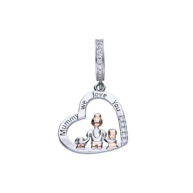 ZAWIESZKA WISZĄCA TYPU BEAD PASUJĄCA NA BRANSOLETY MODUŁOWE O ŚREDNICY MAX 3mm, POŁĄCZENIE SREBRA PRÓBY 925 RODOWANEGO ZE ZŁOCONYM NA RÓŻOWO, BIAŁE CYRKONIE, MAMA, DZIECI, NAPIS "MUMMY WE LOVE YOU", WYMIARY SERCA 16mm X 17mm.