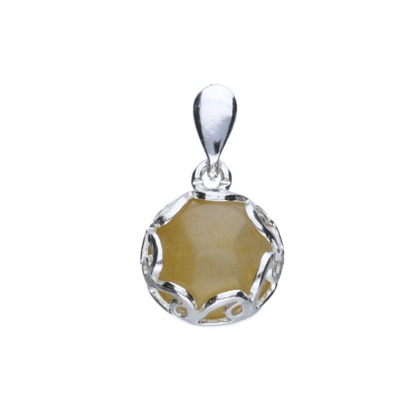 ZAWIESZKA Z KAMIENIEM NATURALNYM, SREBRO PRÓBY 925 SREBRZONE, ŻÓŁTY JADEIT OPRAWIONY W OZDOBNĄ AŻUROWĄ RAMKĘ, ŚREDNICA ZAWIESZKI 12mm.