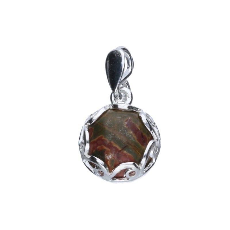 ZAWIESZKA Z KAMIENIEM NATURALNYM, SREBRO PRÓBY 925 SREBRZONE, CZERWONY TURKUS OPRAWIONY W OZDOBNĄ AŻUROWĄ RAMKĘ, ŚREDNICA ZAWIESZKI 12mm.